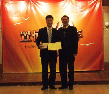 姚毅总经理为英国威廉集团官网十周年“奉献奖”获得者周虎颁奖